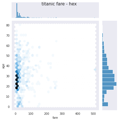 j3.fig.suptitle('titanic fare - hex', size=15)