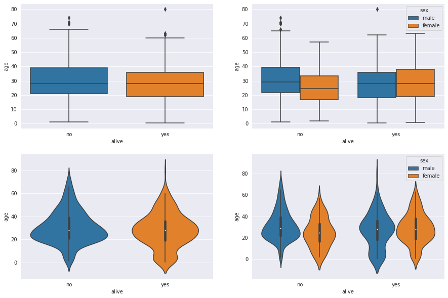 sns.violinplot(x='alive', y='age', hue='sex', data=titanic, ax=ax4)