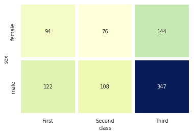heatmap() 메소드는 2개의 범주형 변수를 각각 x, y축에 놓고 데이터를 매트릭스 형태로 분류한다.