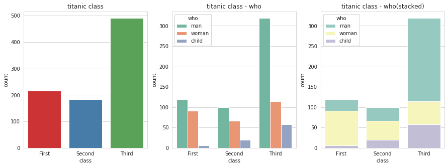 ax3.set_title('titanic class - who(stacked)')