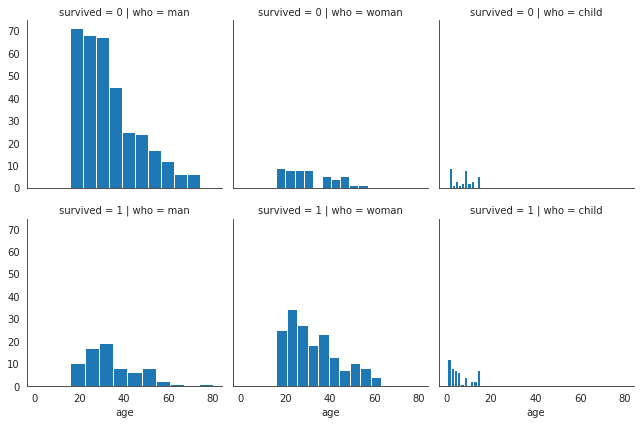 g = sns.FacetGrid(data=titanic, col='who', row='survived')